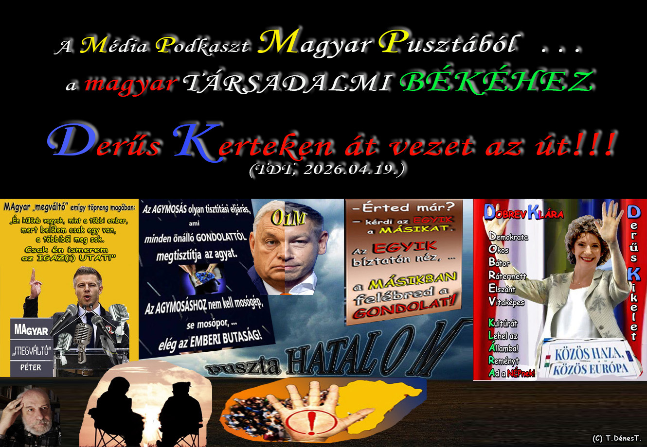 Hogy egyszer majdan, Olcsó Voksokat hord a NERdei szél! Míg a Puszta médiában egy Macsó Prédikátor tátog, mint Ocsmány Varjú károgva beszél! . De amott lám Derék Kezek nyúlnak a NÉP felé! Derûs Kikelet ébred, és a PUSZTA HATALOM megrendül belé! (TDT) |